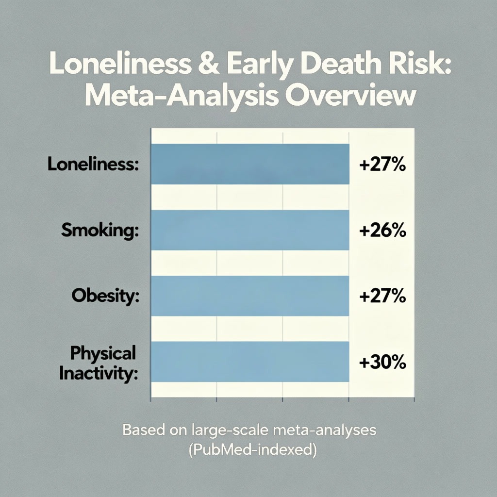 A landmark meta-analysis by Holt-Lunstad et al. (2015) demonstrated that social isolation and loneliness increase all-cause mortality risk at levels comparable to smoking and obesity. Loneliness is associated with increased inflammation, impaired immune function, sleep disruption, depression, and cognitive decline.
